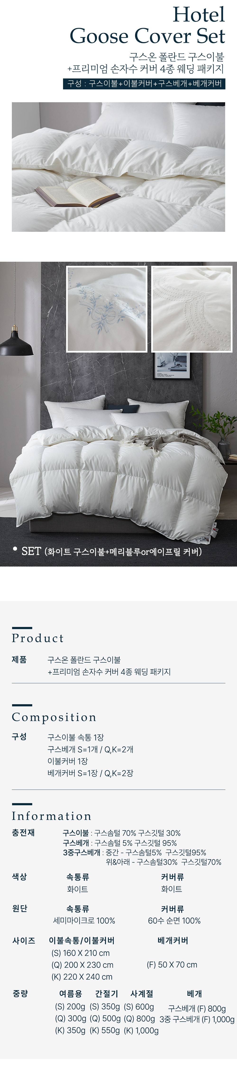 | 모델명 | 폴란드 구스70 호텔 이불+베개+프리미엄 손자수 커버 4종 웨딩 세미 패키지 |