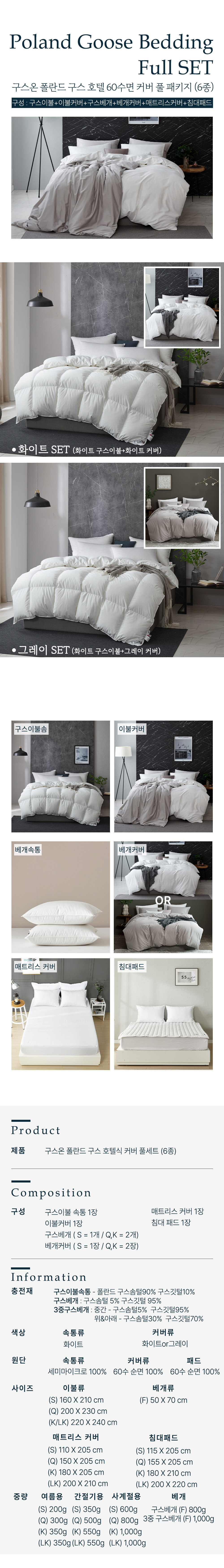| 모델명 | 폴란드 구스90 호텔 이불 60수면 6종 웨딩/혼수/이사 풀 패키지 |
